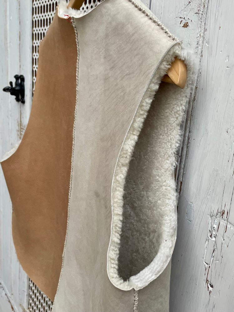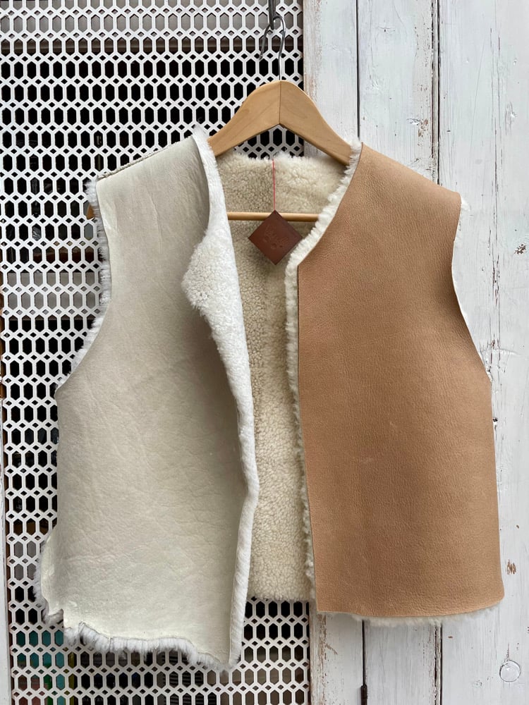 Each of these one-of-a-kind waistcoats is hand cut and hand stitched in my studio using beautifully soft sheepskins sourced from the fashion industry. The skins come from high-end clothing houses — sometimes slightly imperfect, sometimes simply surplus from larger production runs.